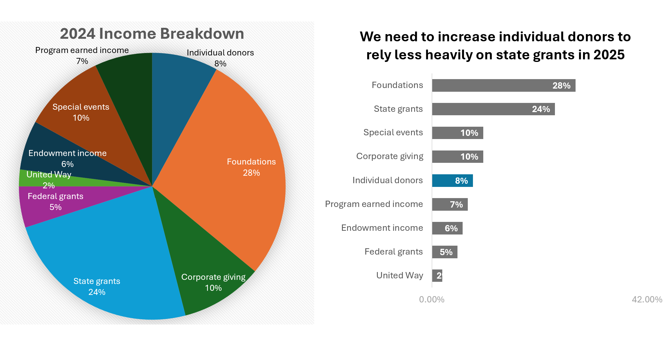 If you want people to understand that you need more individual donors, a tiny slice of a 20-piece pie will not do the job. It tells people your funding is complicated, not that you need support.